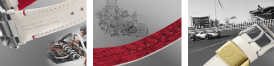Нижняя часть ремешка выполнена из ультра-замши, а вот лицевая сторона из натуральной кожи наппа украшена напечатанной схемой 1.5-литрового двигателя V12 болида RA272. Honda сделала необычный для тех лет выбор, установив в машину 12-цилиндровый мотор, и этот инженерный подвиг теперь увековечен на часах. Выглядит как чертёж — очень стильно и технологично.