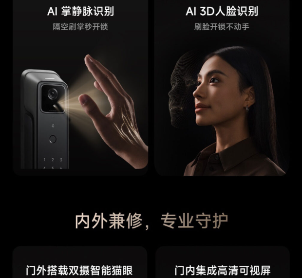 Xiaomi Smart Door Lock 4 Pro Dual Camera Edition сочетает передовые сенсоры и ИИ для беспрецедентной защиты. Основной фишкой стал ИИ-распознавание вен ладони: система использует инфракрасный свет, чтобы сканировать уникальный узор вен, с ложным отказом менее 0,001% и скоростью разблокировки до секунды. Дополняет это 3D-распознавание лица с сертификацией BCTC — работает даже в темноте, с защитой от подделок фото или видео.