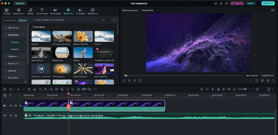 Filmora — это отличный выбор для тех, кому нужно больше, чем в простых редакторах, но не хочется переплачивать за профессиональный софт. Программа предлагает сотни встроенных эффектов, переходов, титров и музыки. Она проста в освоении, но при этом позволяет делать вполне серьёзные проекты. В бесплатной версии есть водяной знак, который снимается подпиской.