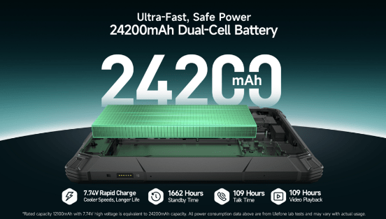 Батарея в Armor Pad 5 — 24200 мАч (двухъячеечная), самая большая в классе rugged-планшетов. С 120 Вт зарядкой вы наберете 20% за 10 минут, а полная зарядка — за час. Планшет может работать как пауэрбанк с 10 Вт реверсивной зарядки — заряжайте телефон или фонарик в походе. Это значит неделю автономии в полевых условиях без подзарядки.